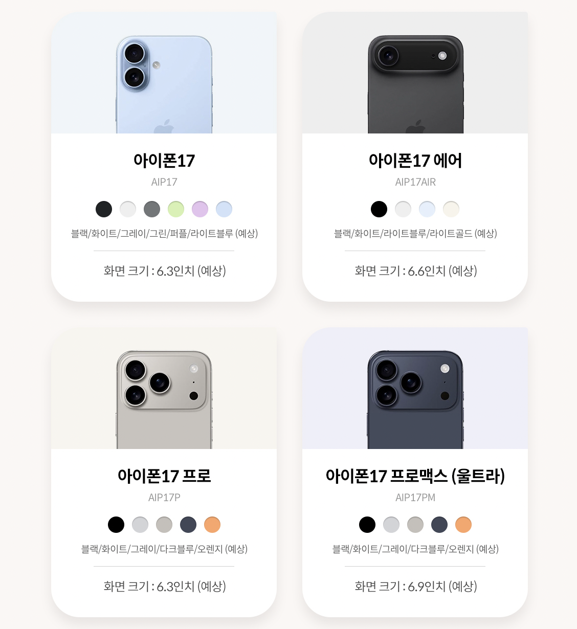 | 라인업 ✅ 아이폰 17 ✅ 아이폰 17 Pro ✅ 아이폰 17 Pro Max ✅ 아이폰 17 Air |